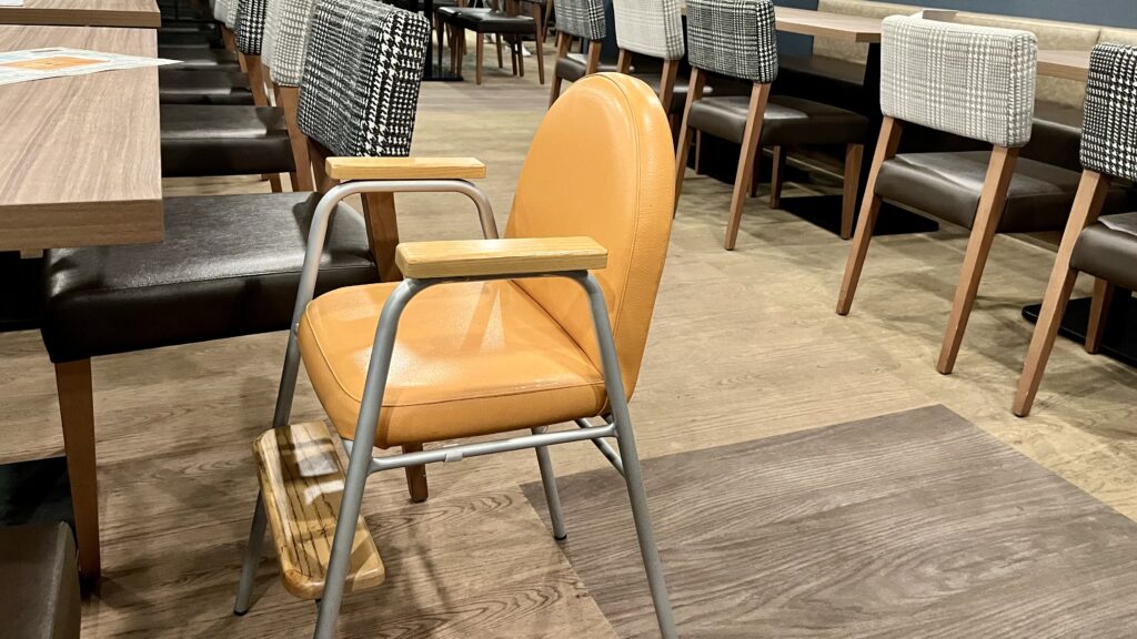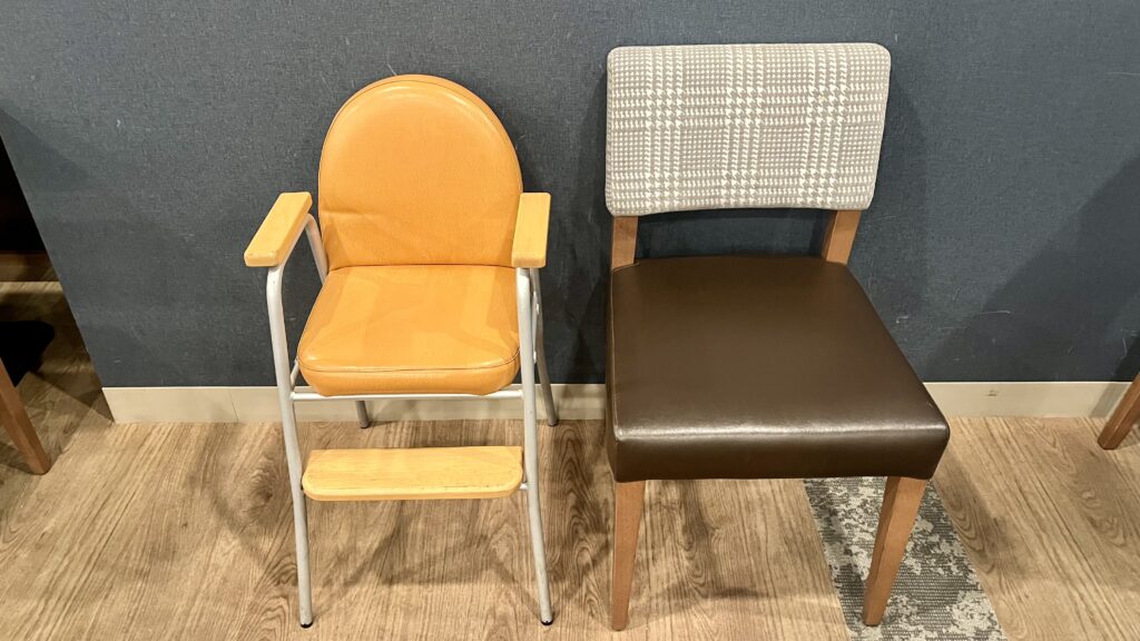 今回使用した椅子はベルトがないハイチェアだったので、落ち着きがないお子さんの場合、チェアベルトを持っていくと安心できます。