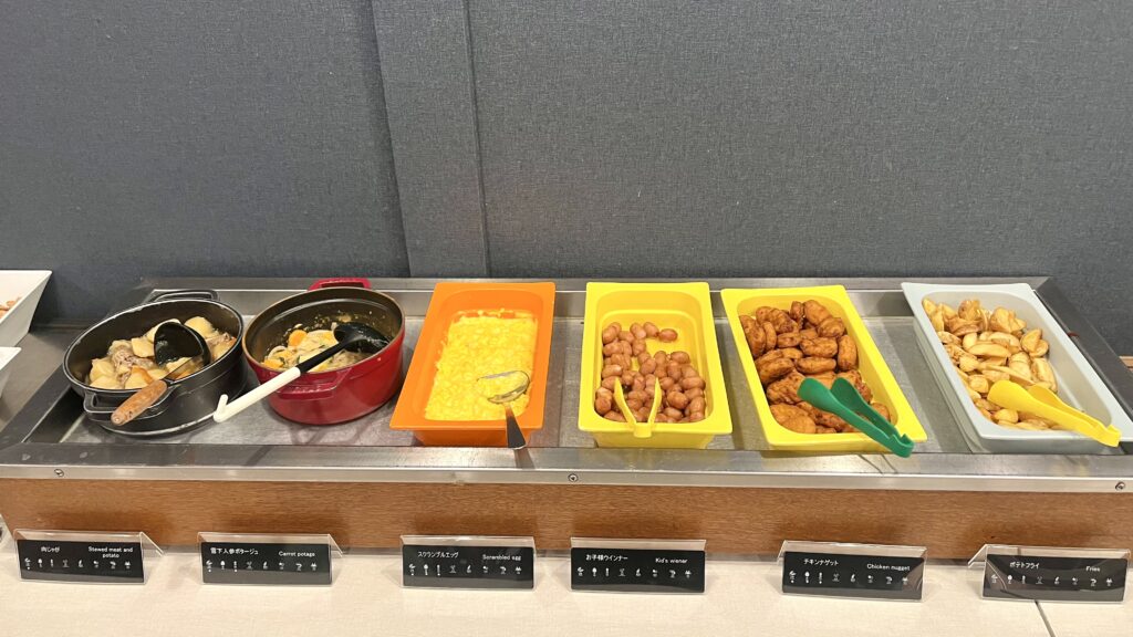 朝食のキッズバイキングコーナーにはスクランブルエッグ、ウインナー、肉じゃがなどのメニューが揃っていました。