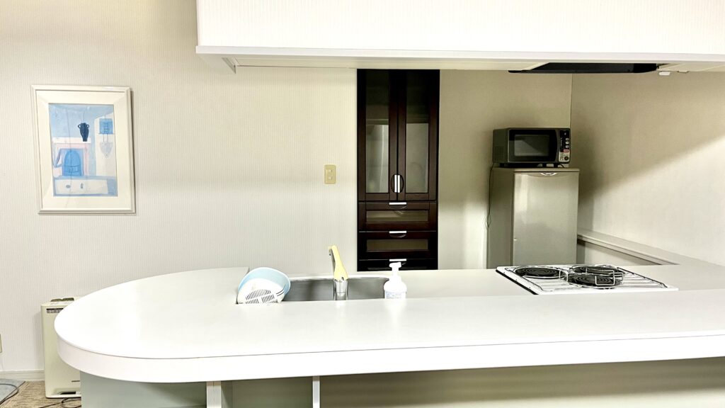 広々としたカウンターキッチンには、食器棚や電子レンジまで完備!