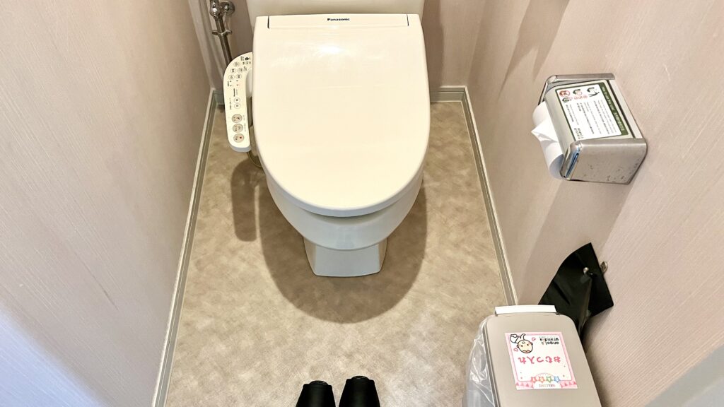 安心してください。トイレにオムツ入れ(蓋つき)が備え付けてありました!