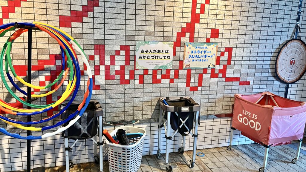 出入り口にフラフープやバドミントンなどの道具もあり、大きい子供でも楽しく遊べそうです。