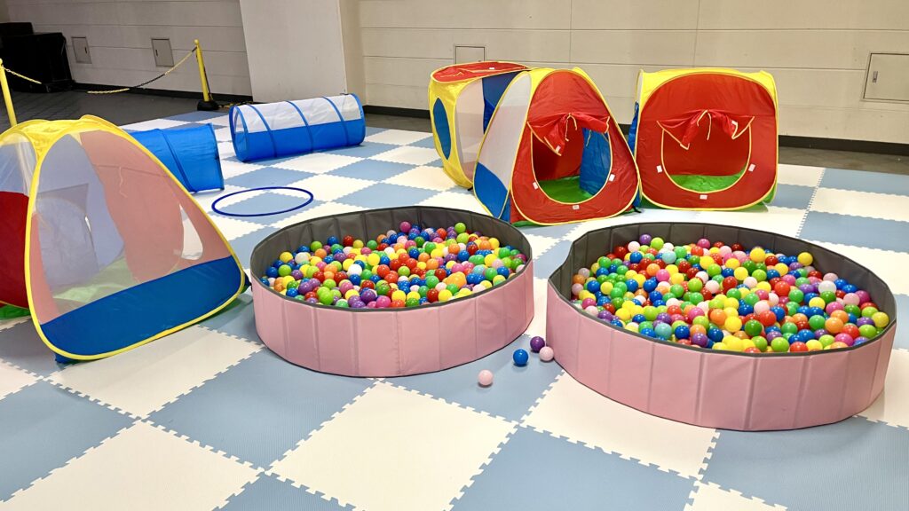 小さな子供でも楽しく遊ぶことが出来るボールプールや布製のトンネルがあります。