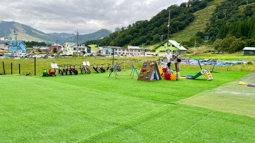 外にも遊び場があり、ストライダーや三輪バギー、小さな滑り台などがありました。