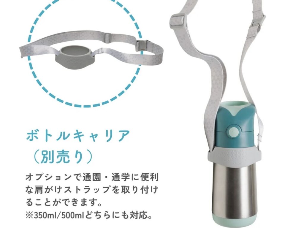 別売りの専用肩掛け用ストラップをつければ、お散歩や遠足にピッタリの肩掛け水筒に早変わり!